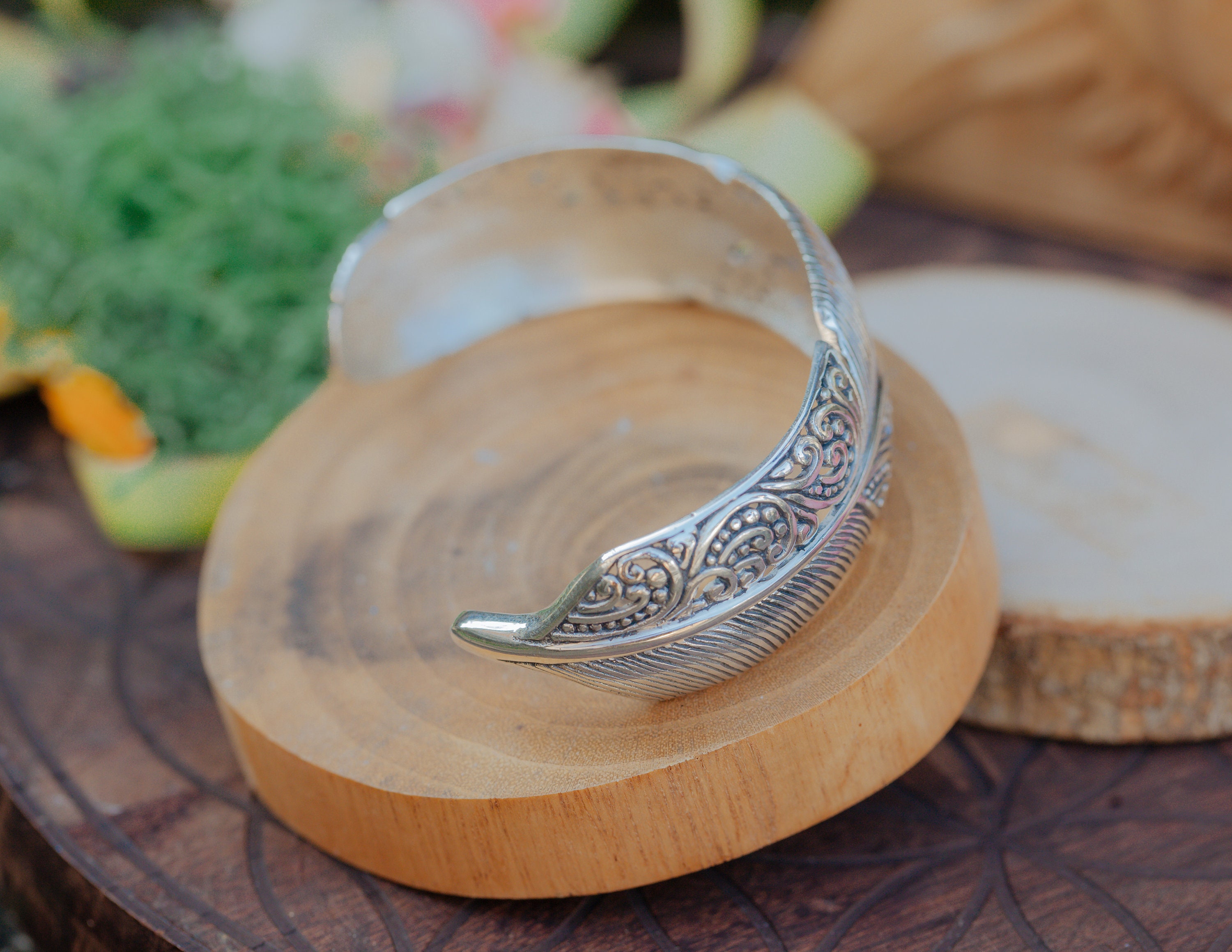 Crafted from high-quality Balinese sterling silver, this piece features traditional Balinese hand carving (Ukiran), showcasing stunning details that make it both exclusive and timeless. The delicate feather design symbolizes a powerful tool for capturing and distributing positive energies, connecting you to the sacred and natural world.